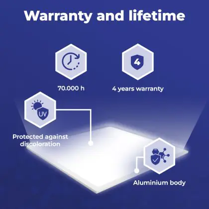 Questo pannello LED ha un ciclo di vita di 70000 ore, che vuol dire che funzionerà in modo ottimale per diversi anni. Questo ti permetterà di risparmiare sui costi di manutenzione e sostituzione! Inoltre, questo pannello LED è protetto da una garanzia di 4 anni. Infine, l'illuminazione LED permette di ridurre le emissioni di CO2 e, non contenendo sostanze tossiche, i LED possono essere riciclati.