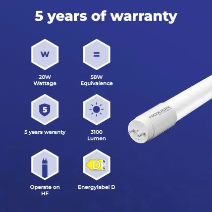 Il Noxion Tubo LED T8 Avant Extreme (HF) High Output 20W 3100lm - 865 Luce del Giorno | 150cm - Sostitutiva 58W è l’alternativa perfetta per il tubo fluorescente standard 58W nelle plafoniere con un reattore. Con questo tubo LED hai una garanzia di una vita media utile molto lunga e 5 anni Lampadadiretta.it di totale garanzia. .